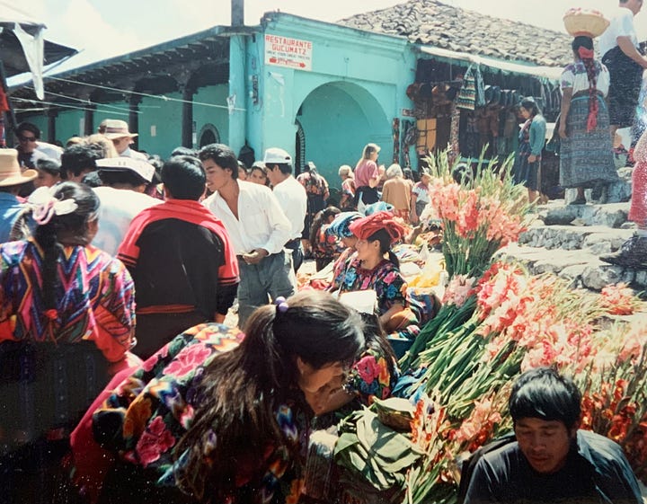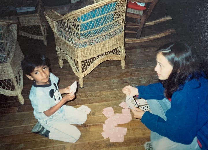 (I thought I had photos of this moment, but I can’t find them. So, here’s a photo of a Guate flower market, and one of me and my adopted brother, Angel, playing cards. 1992).