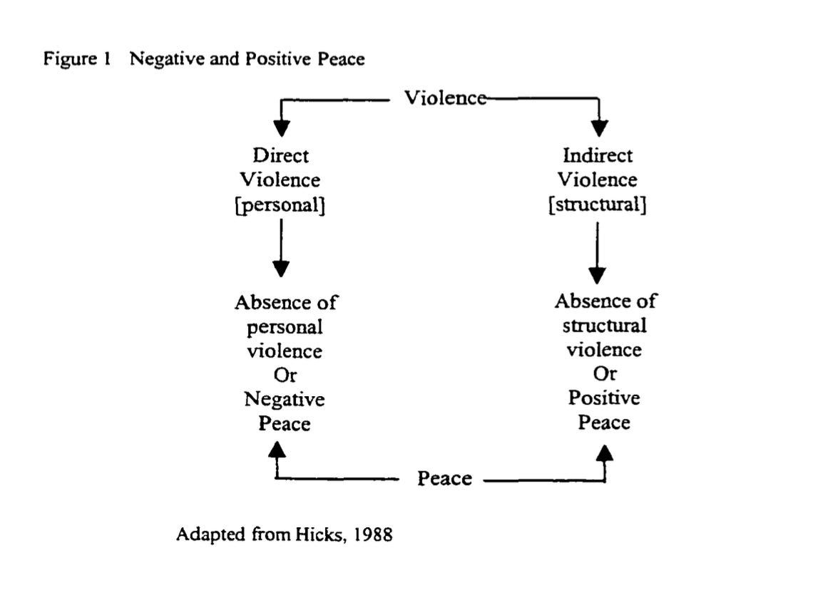 Negative Peace, as a concept, focuses on reducing/ending war and all physical violence. Education for negative peace develops a citizenry that is well-informed to take action for the achievement of peace through eradicating direct violence and working for disarmament… Positive Peace requires the amelioration of all structural and systemic obstacles to peace, and thus the creation of true peace. In addressing the need for justice, equity, democracy, and an end to structural violence, positive peace takes concern beyond the end of war and physical violence.